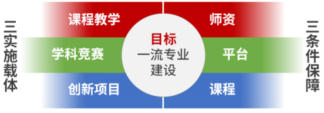 “1+3+3”实验教学新范式:聚焦一流本科专业建设目标,开展“团队、平台、课程”三条件保障建设,推动“课程教学、学科竞赛、创新项目”三载体课内外实践,形成“1+3+3”多维协同育人实验教学新范式。